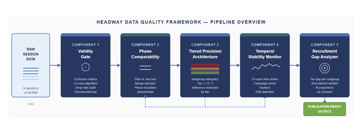 To support reliable online behavioral measurement, Headway developed and deployed a modular data quality framework operating across the full data lifecycle. The framework includes: